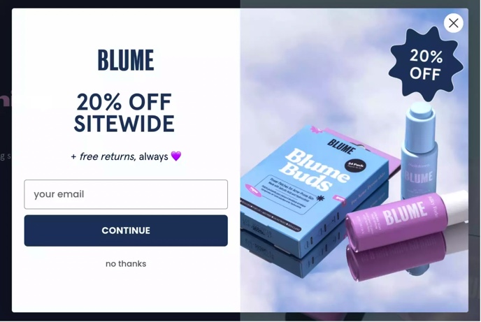 On-site pop-ups are one of the easiest ways to collect email addresses from potential customers. Many DTC brands add a pop-up window to their home page that asks customers to provide their email address in exchange for a discount or special offer. According to some sellers running on Shopify, adding a email collection pop-up to your Shopify theme can help you increase your leads by up to 500% and improve your checkout rate by 35%. Those numbers seem pretty extreme to us, but by adding an email collection pop-up, Rivo has seen brands cut their CAC by over 50%.