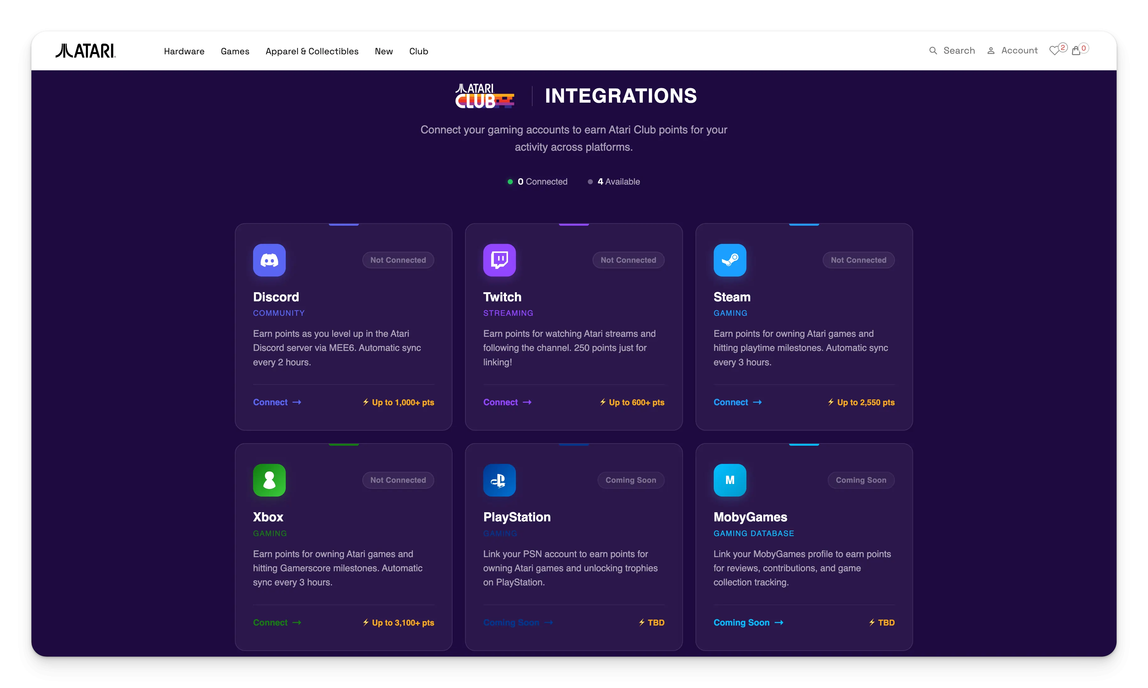 The Atari Club integrations hub lets members link their gaming profiles from across the internet, and all of it flows back to Atari Club as the central hub.