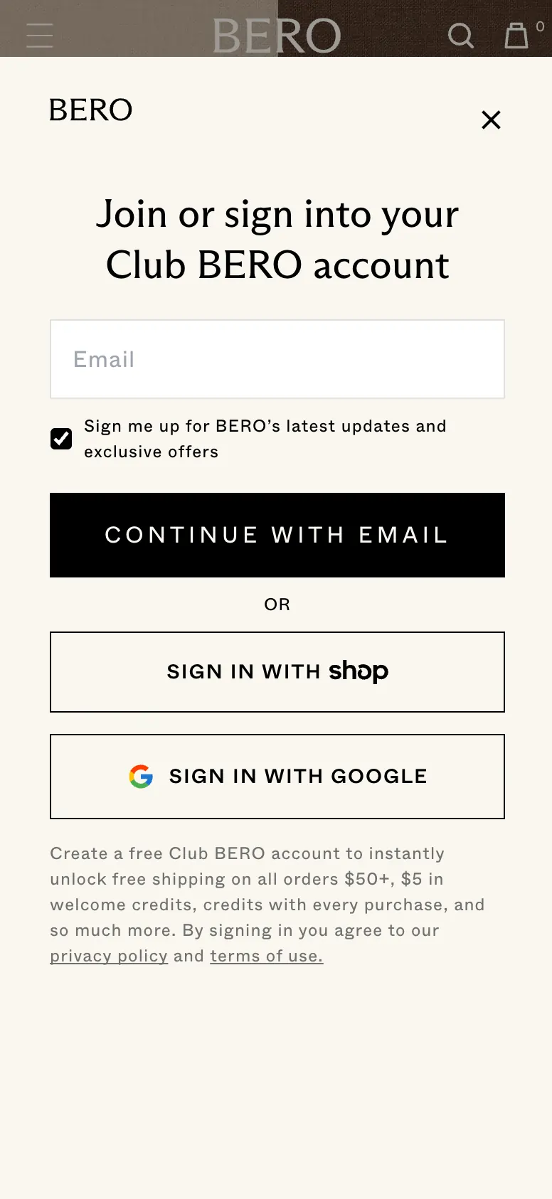 - Cart integration: At checkout, a prompt offered shoppers the option to “Join Club BERO” for $55/year, listing the benefits directly in the cart modal. Membership is part of the path to purchase.