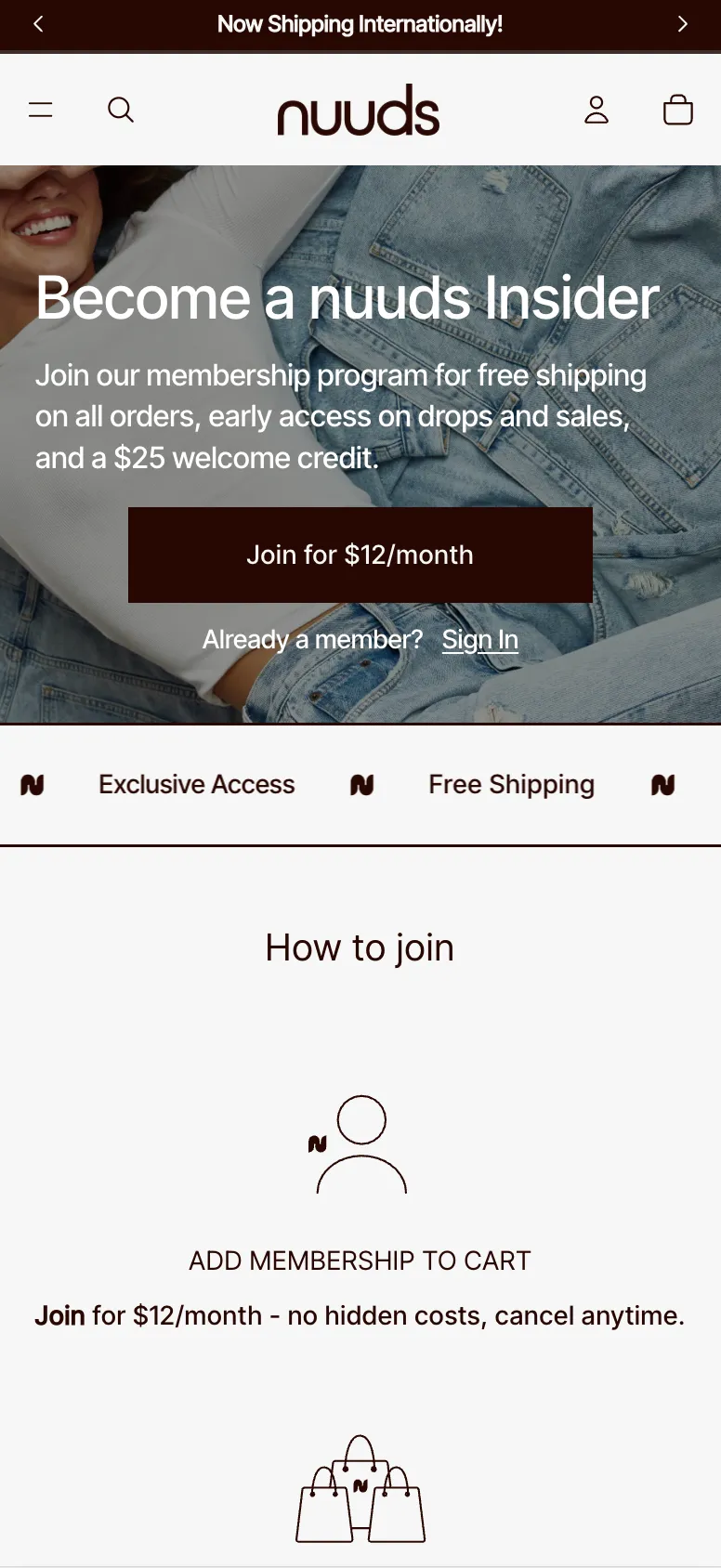 The PDP-level gating is the part of the program that does the real work. On member-only and early-access products, nuuds hides the Add to Cart button for shoppers outside the club. Shopify Flow assigns the gating tags. Rivo enforces them at the account and checkout layer. The nuuds theme swaps the Add to Cart button for a membership prompt whenever a non-member lands on a gated page.