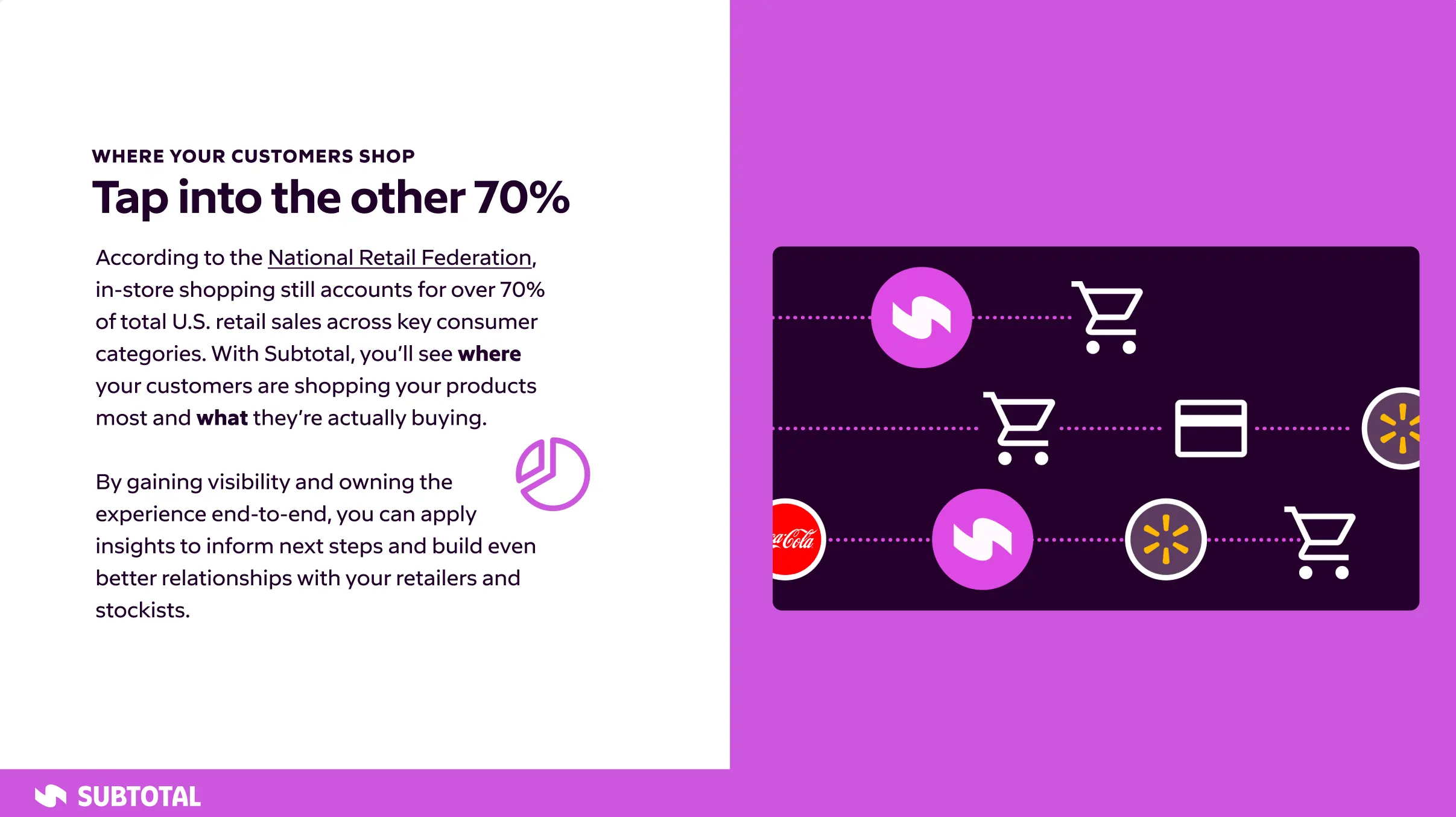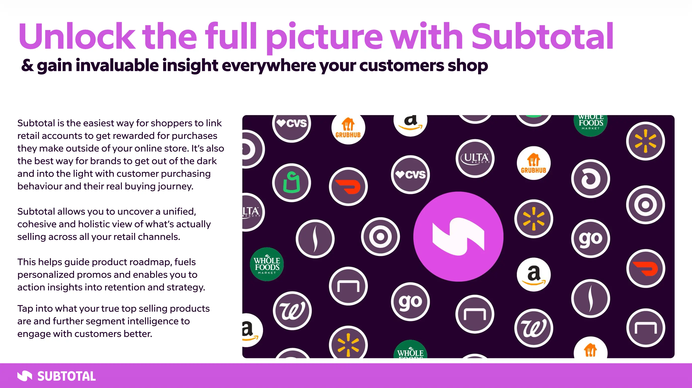 - Customers use Subtotal to connect their retail accounts (Amazon, Walmart, Sephora, and more) to their Rivo account.