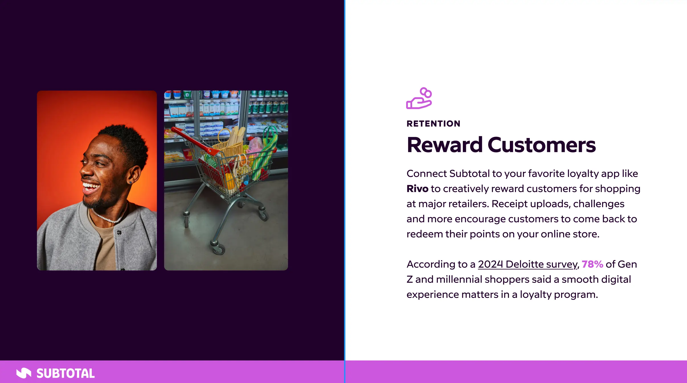 Subtotal’s integration with Rivo makes it easy to reward customers for purchases at major retailers. With Subtotal, shoppers can securely connect retail accounts—from top retailers like Amazon, Walmart and Sephora—directly to their Rivo profile. Once connected, eligible purchases are detected and rewarded automatically.